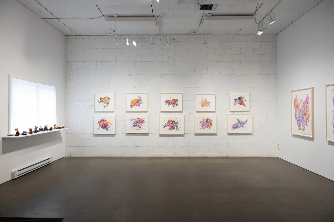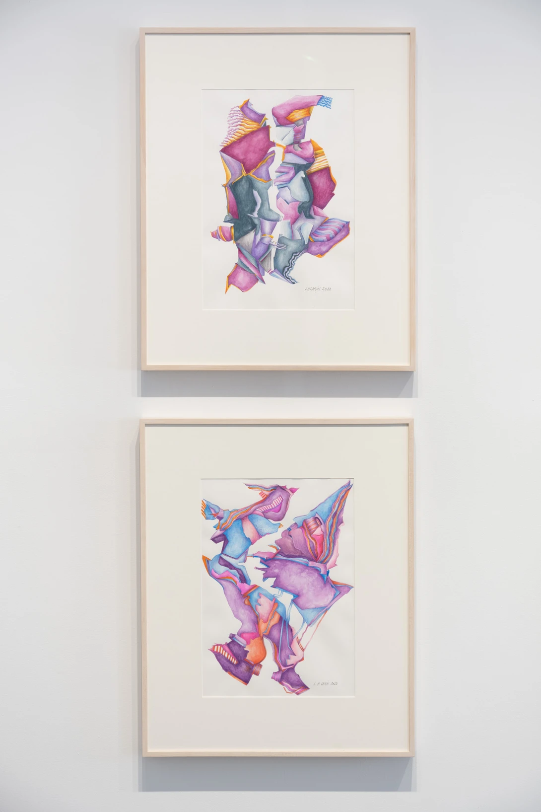 My second generation of drawings, the couples, emerged by exploiting the negative space of the small-scale solos. They are standing duos that will impose themselves through their scale, especially in my new generation of drawings at Erga. I also created an installation by separating them using the computer. I wanted them to interact with people on a human scale.